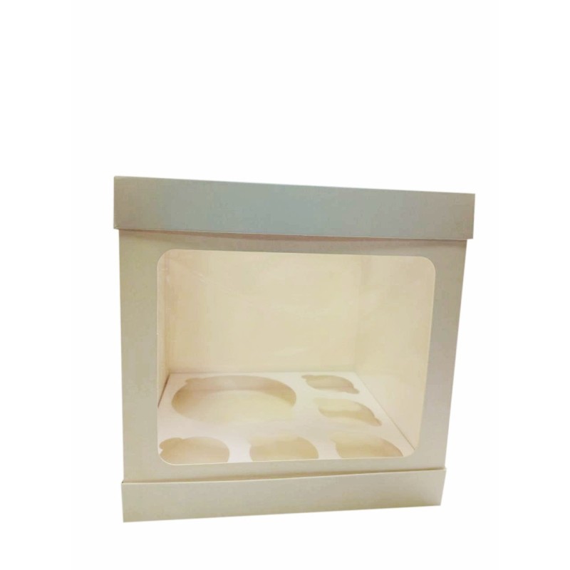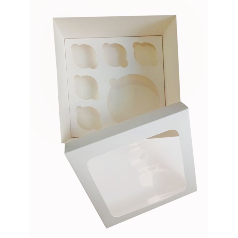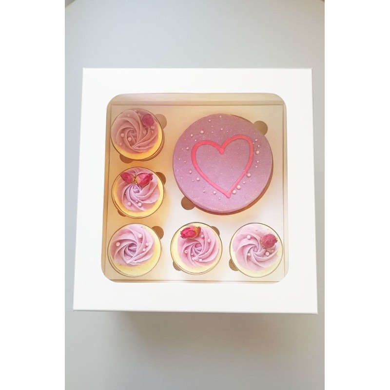 Коробка біла з віконцем на кришці та додатковим віконцем збоку із чотирьох частин: кришки, дна, бокової частини та ложементу для бенто тортів, п'яти капкейків.