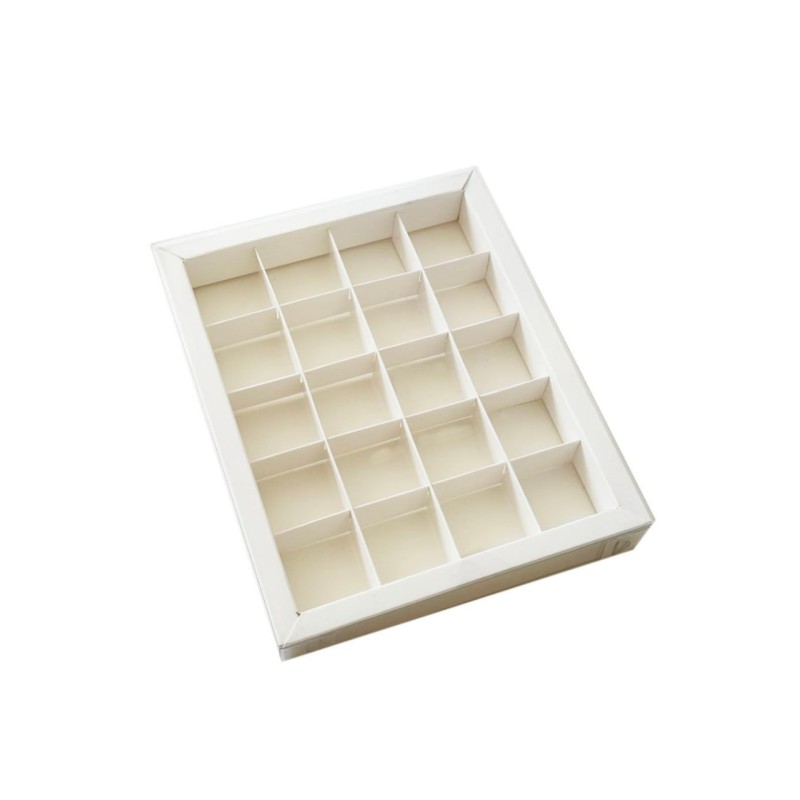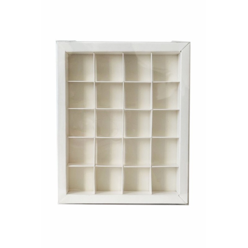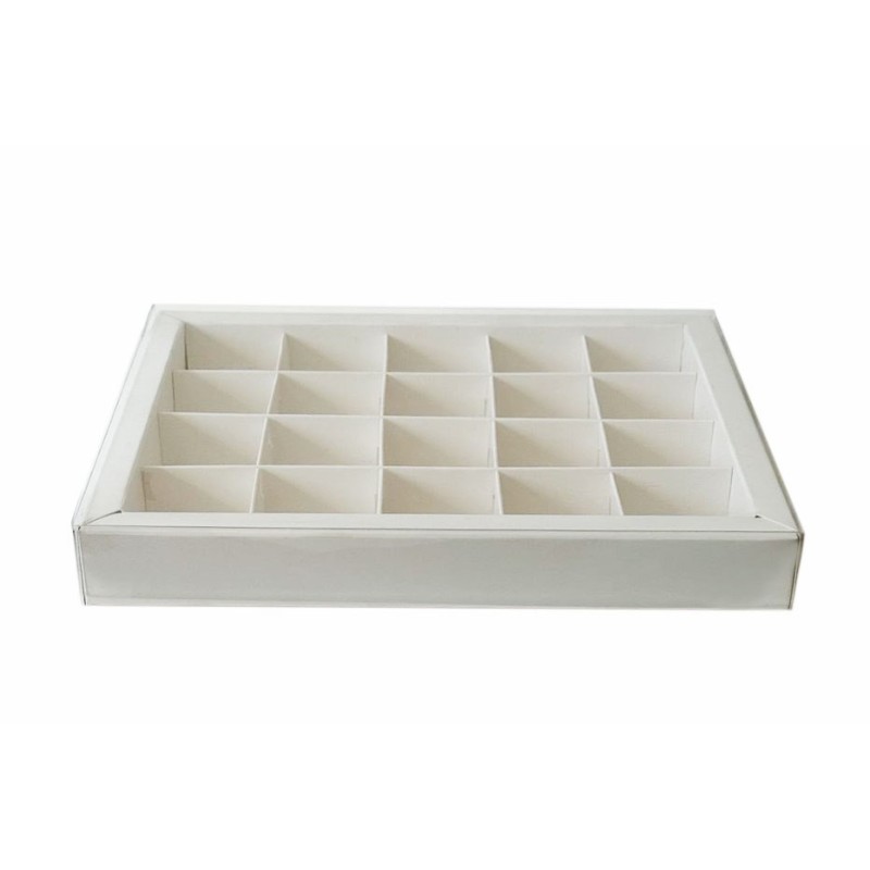 Коробка для 20 цукерок біла, з бортиком і прозорою пластиковою кришкою, яка надає вашим виробам шарму, індивідуальності і неперевершеного вигляду.
