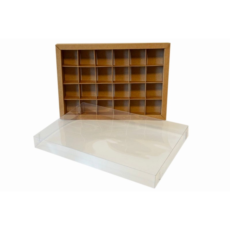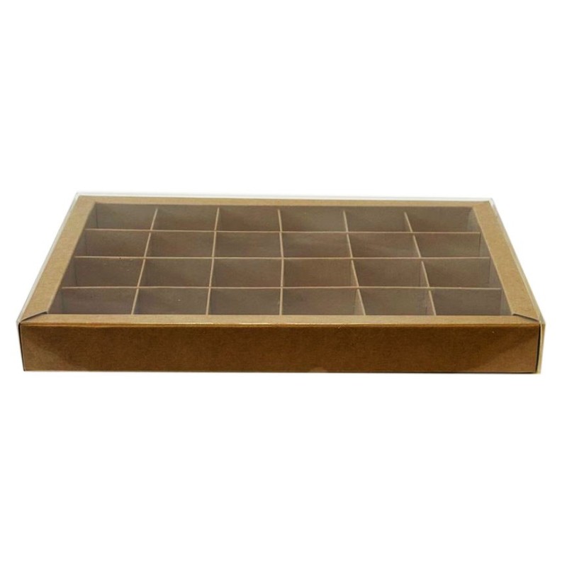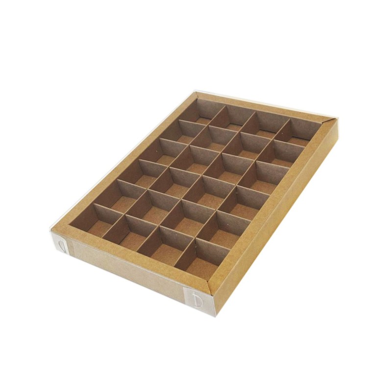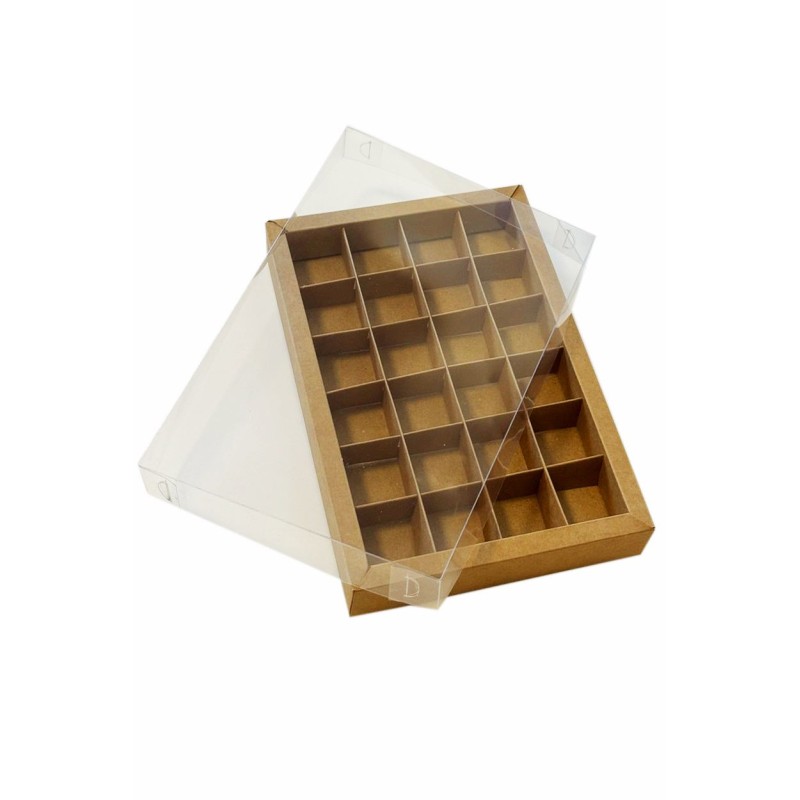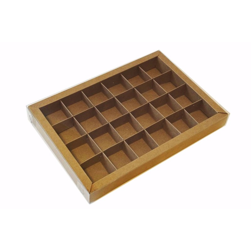 Коробка для 24 цукерок крафтова, з бортиком і прозорою пластиковою кришкою, яка надає вашим виробам шарму, індивідуальності і неперевершеного вигляду.