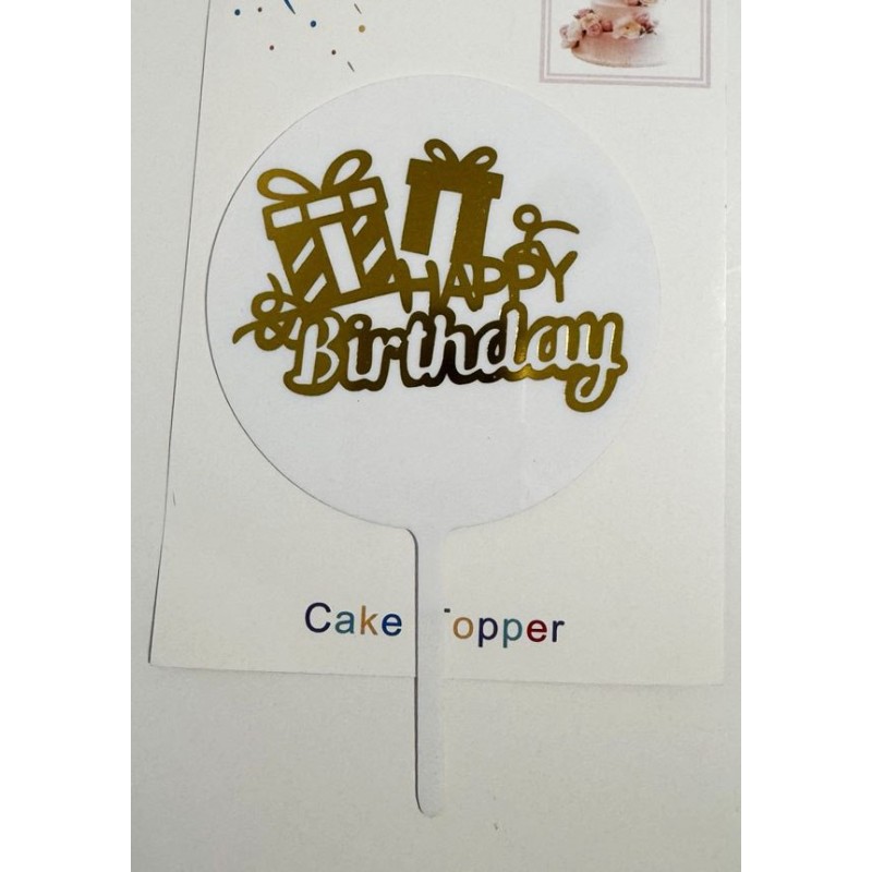 Топпер "Happy birthday” круглий, білий з подарунками, акриловий пластик.