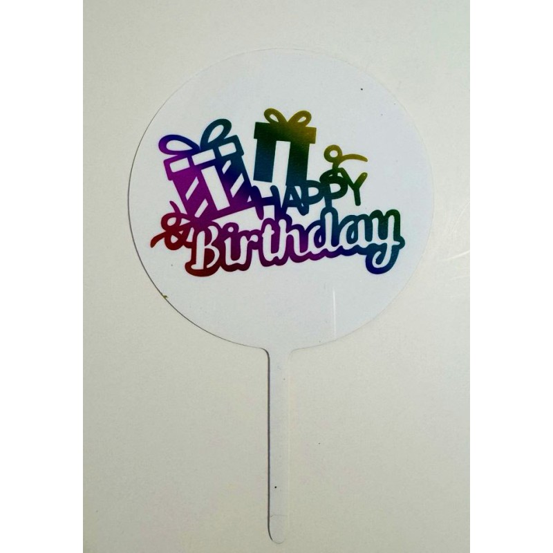 Топпер "Happy birthday” круглий, білий з подарунками, голограма, акриловий пластик. Розмір - 11 х 16 см...