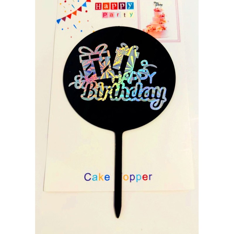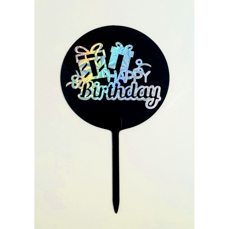 Топпер "Happy birthday” круглий, чорний з подарунками, голограма, акриловий пластик. Розмір - 11 х 16 см...
