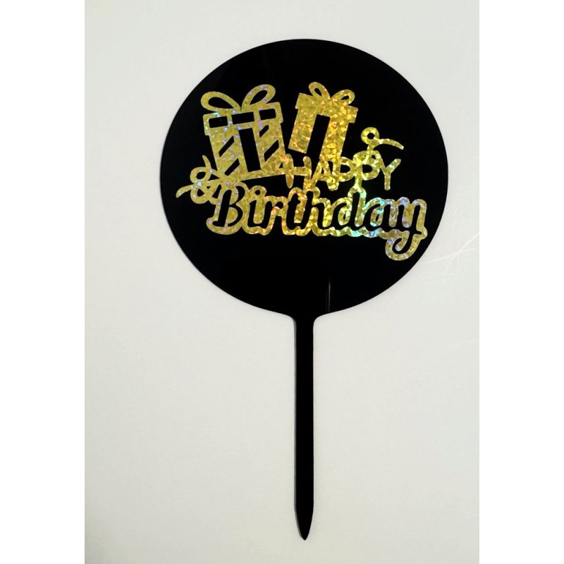Топпер "Happy birthday” круглий, чорний з подарунками, напис - золота голограма, акриловий пластик.