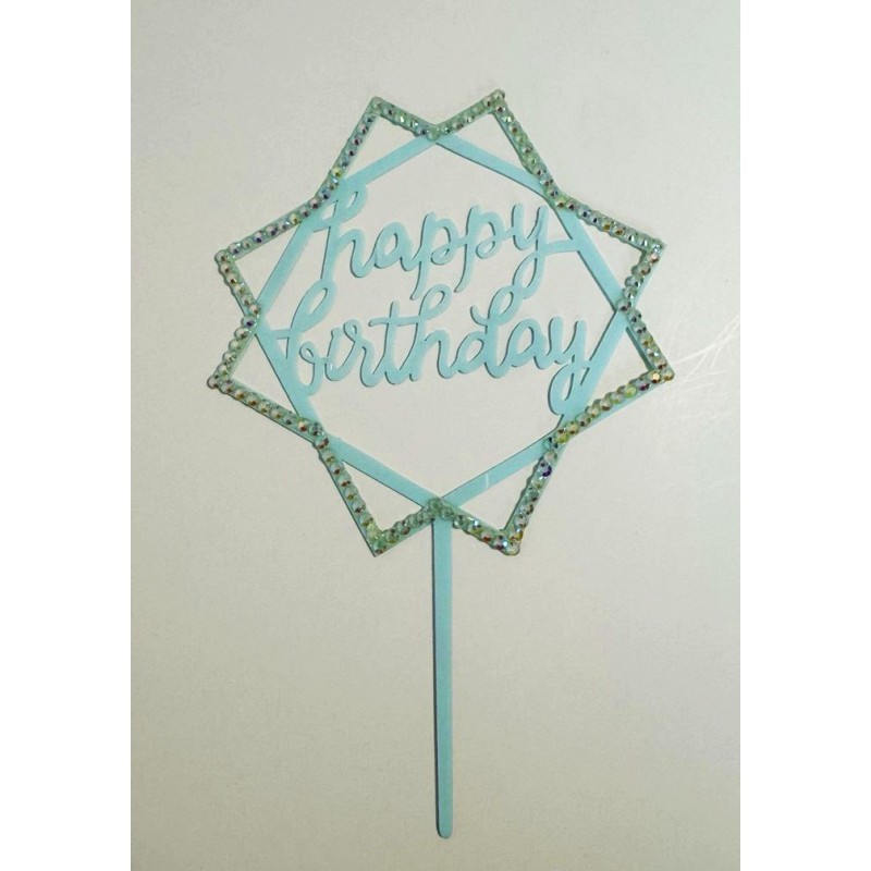Топпер "Happy birthday” Квадратики, блакитний зі стразами, акриловий пластик.