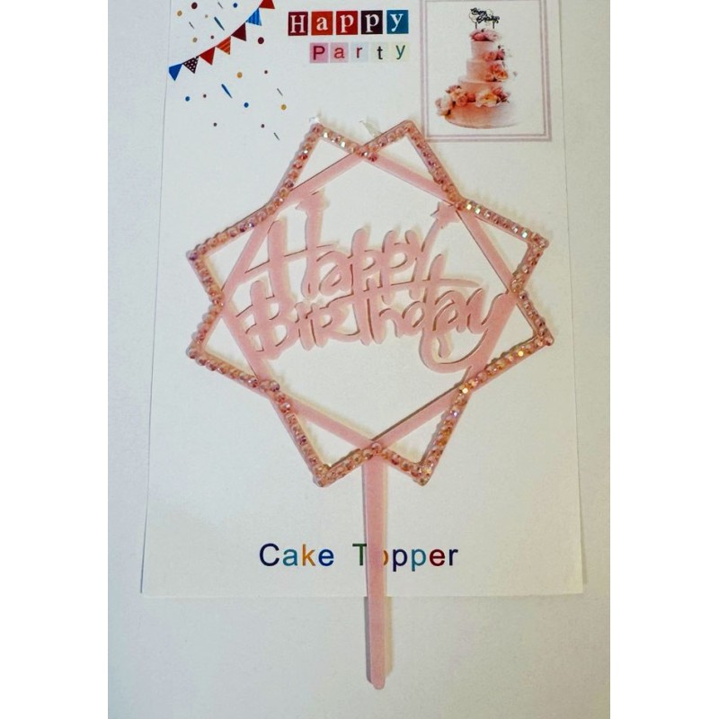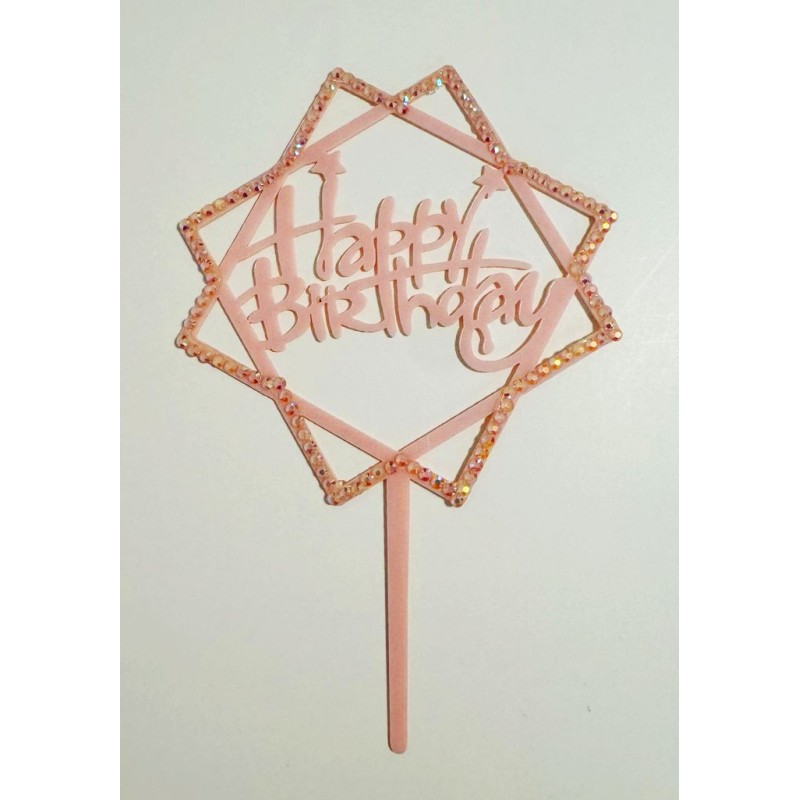 Топпер "Happy birthday” Квадратики, ніжно рожевий зі стразами, акриловий пластик.