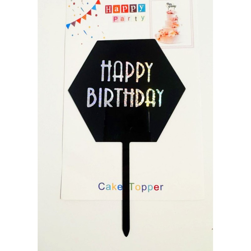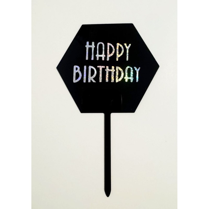 Топпер "Happy birthday” шестигранний чорний срібло, акриловий пластик.